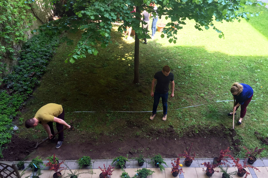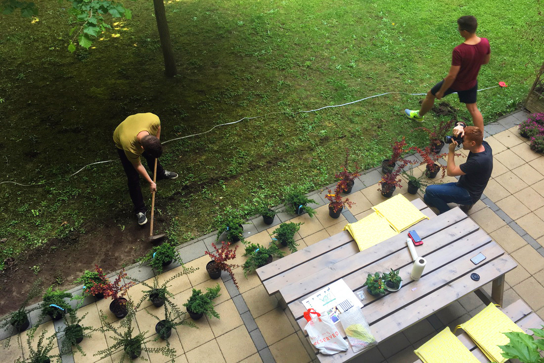 After our thorough and detailed planning process, we started the landscaping and building of our local garden on the afternoon of the 26th of May. We decided to rebuild the outside surrounding of our downstairs office to make a better, greener and more work friendly environment. Our aim was to make a sustainable garden that is easily maintainable with simple tools in every season of the year.