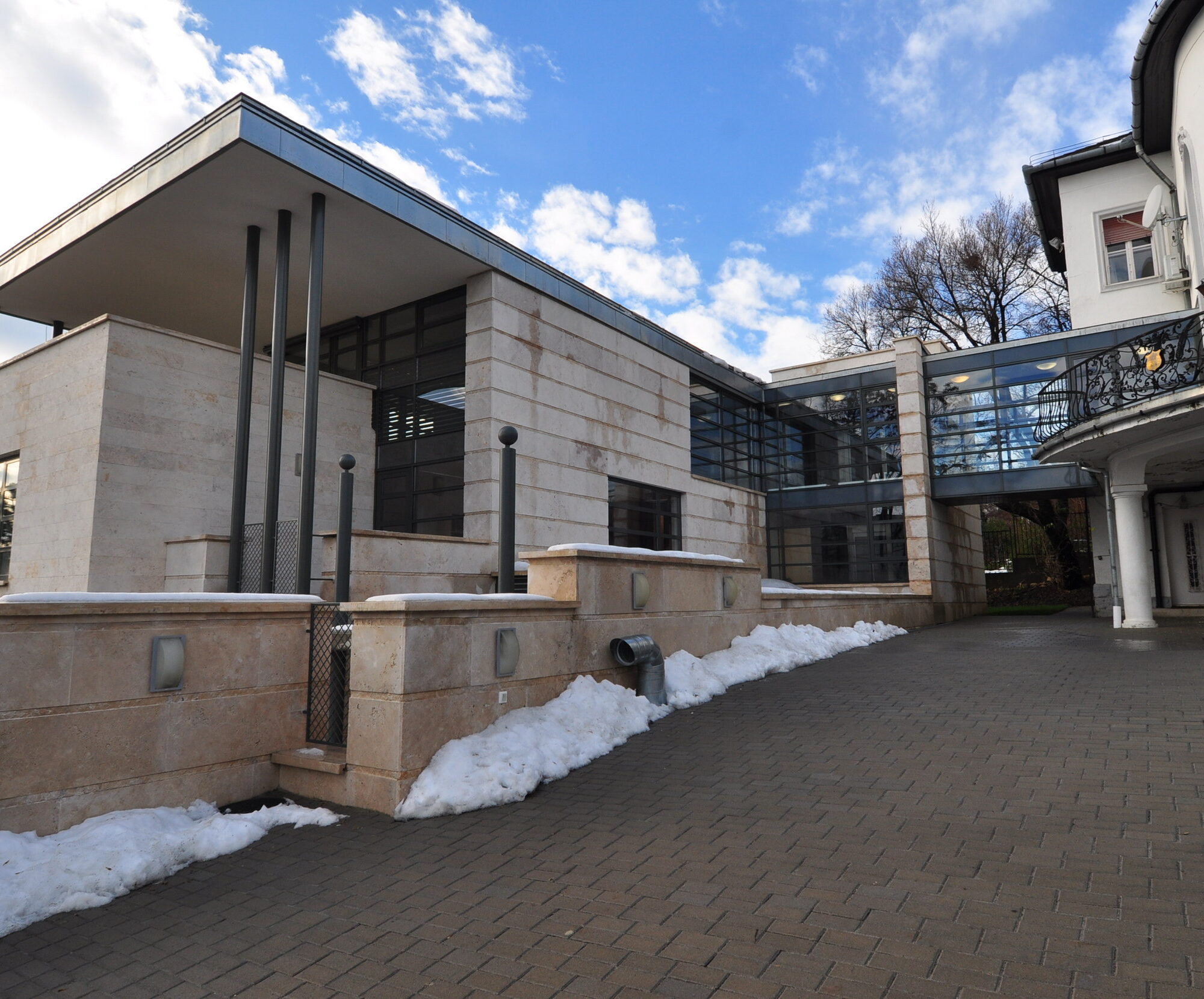 A Rózsadombon elhelyezkedő követségi épület bővítése egyaránt kapcsolódik a telek eredeti bejáratához, az új gépjármű behajtóhoz valamint délről a meglévő épülethez. A telek déli lejtésű, így az új épület a meglévőtől mélyebben fekszik. Az épület magassági elhelyezésével igyekeztünk elérni, hogy minél kevésbé vegye el a kilátást a meglévő irodáktól. Így amennyire lehetett, föld alá került az épület egy része, a garázsszint és a földszint nagy része is. A pinceszinten 11 férőhelyes gépkocsiparkolót, gépészeti helyiséget, valamint a lakáshoz tartozó tárolót helyeztünk el. A szintek közötti közlekedést a közös lépcsőház és lift biztosítja. Az épület tömegében és homlokzatformálásában kettősséget mutat; egyrészről egy mai korszerű irodaépület funkcionalista formálása, másrészről az építtetői igényként jelenlévő tradicionális indiai építészeti stílusjegyek megjelenése ötvöződik. A tömegek mozgalmassága, a nagy üvegfelületek, az ősi indiai formai elemek mai anyagokkal való megfogalmazása egyértelműen jelzik az épület születési dátumát, miközben az anyaghasználat és egyes részletek kialakítása utalnak kulturális gyökereire. A zárt, tömbszerű előadóterem súlyos kőburkolata – amely a lécsőház tornyán a legfelső szintig végigvonul – keretet ad a megjelenő változatos formáknak és anyagoknak. A felmenő szintek tömör felületein szereplő könnyedebb kőosztás és az irodák homlokzatát alkotó üvegfal rasztere igazodik a kőfal által meghatározott rendhez.