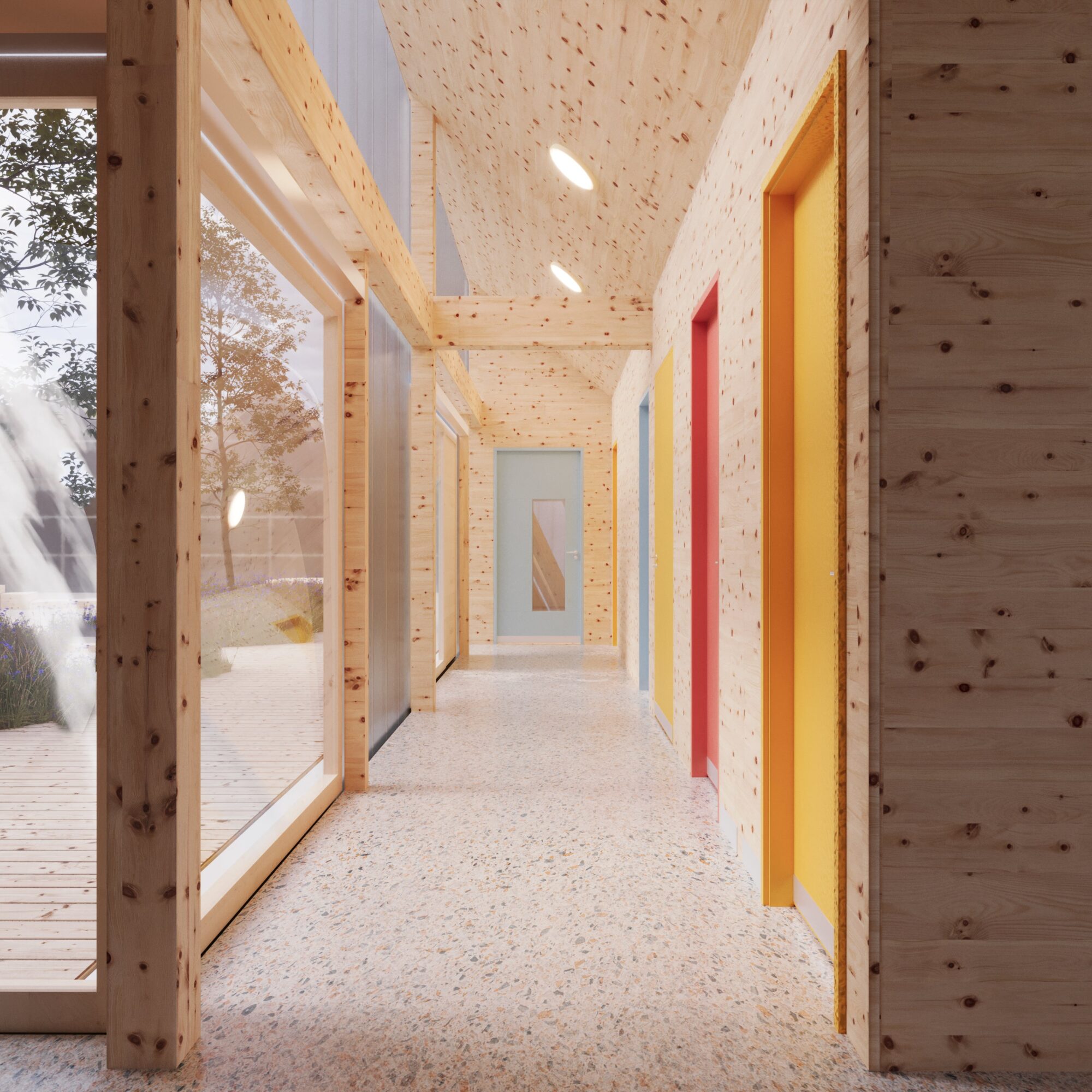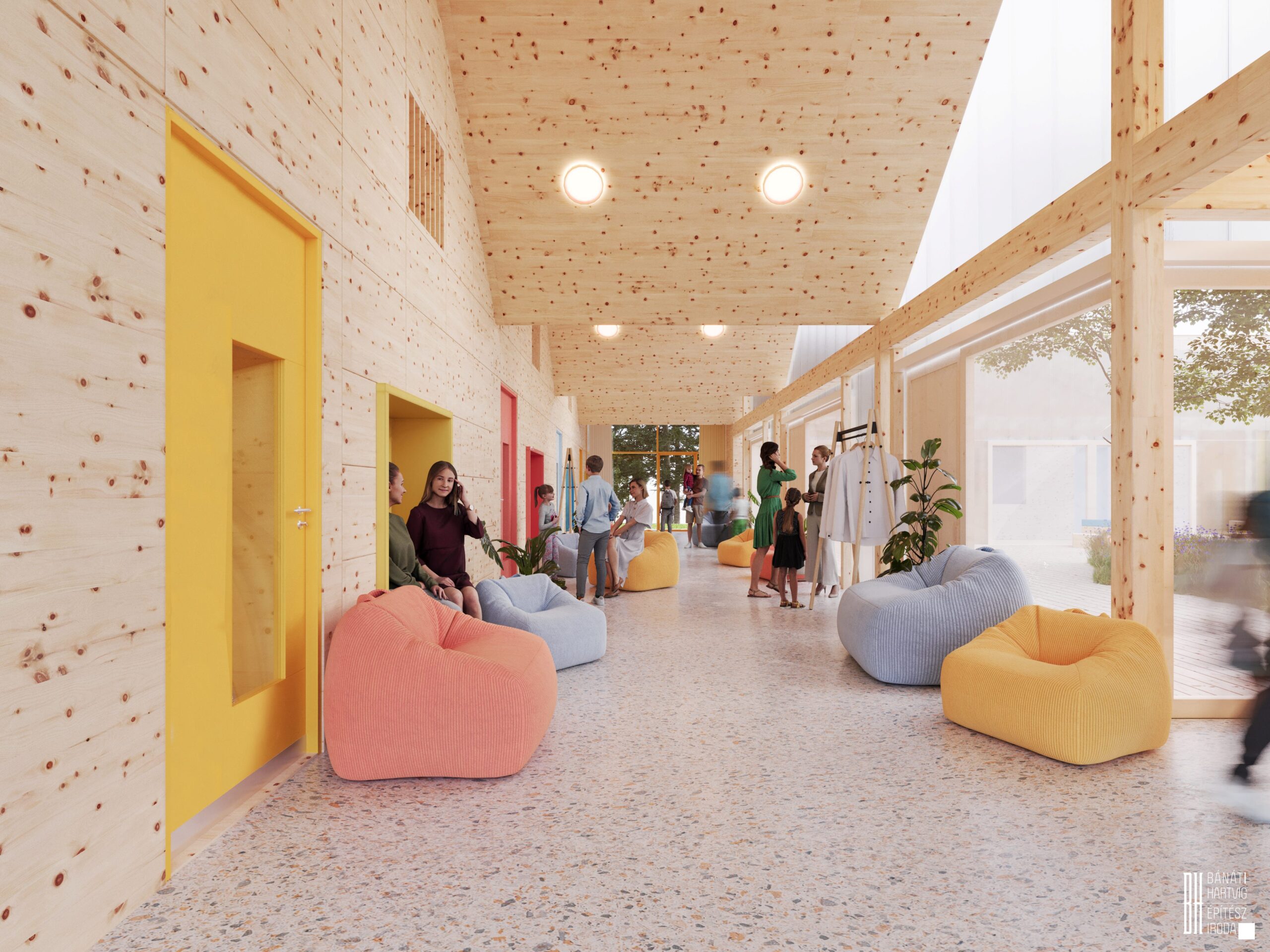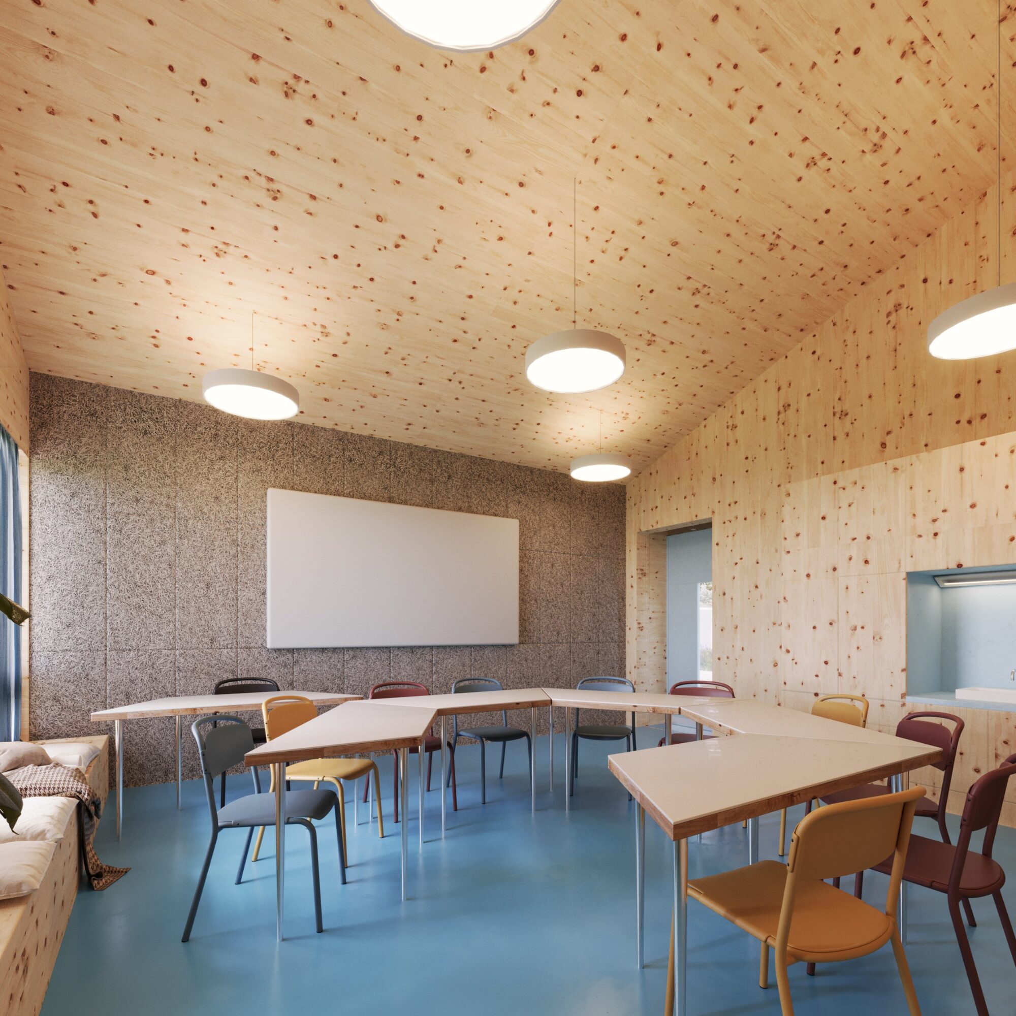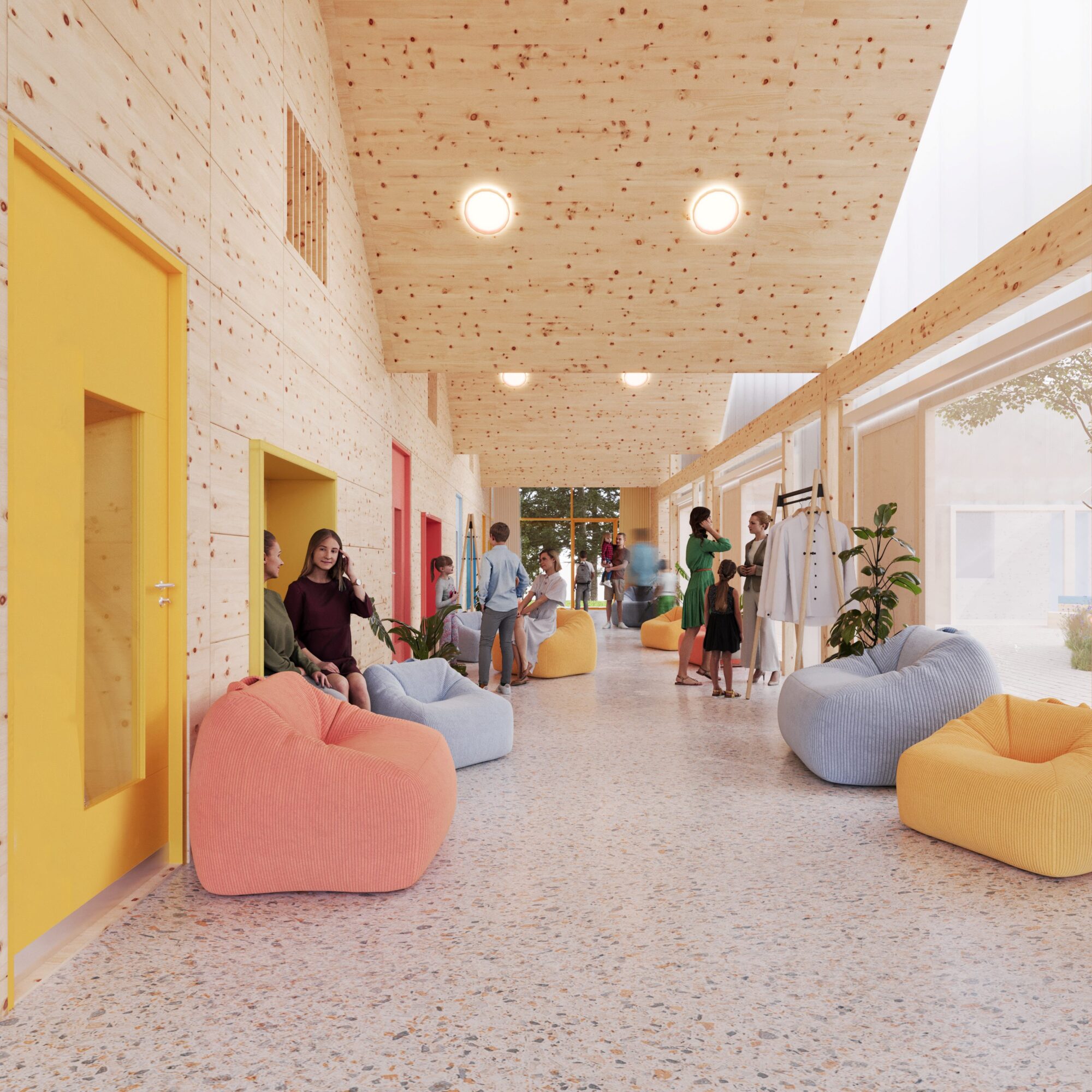A megbízóval, illetve az épületet bérlő és használó iskolával egyetértésben, majd a kivitelezést végző Hello Wooddal közösen gondolkodva olyan épületet hozunk létre, mely a lehető legkisebb lábnyomot hagyja maga után, anyaghasználata és kialakítása révén pedig jótékony hatással van az emberi szerveztre – így maga az épület is hozzájárul az iskolás gyerekek fejlődéséhez.