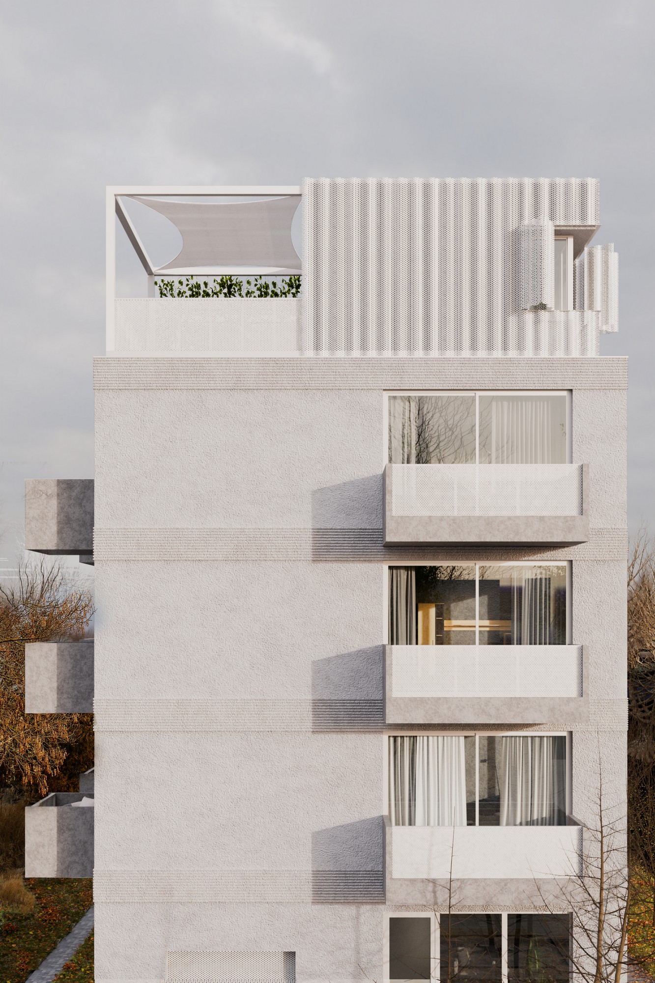 A külső megjelenést meghatározza a belső tartószerkezeti rendszer funkcionális, raszteres rendszere. Ennek megjelenítéséhez alapvetően egyszerű anyagokat, strukturált és húzott nemesvakolatot használtunk az általános szinteken, a födémek vonalában csíkokat kialakítva. Ezek között feszül a strukturált vakolati mező, melyben teraszajtók, illetve parapetes ablakok találhatóak.