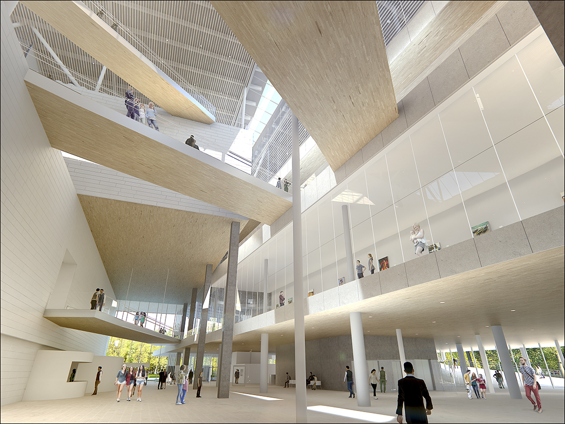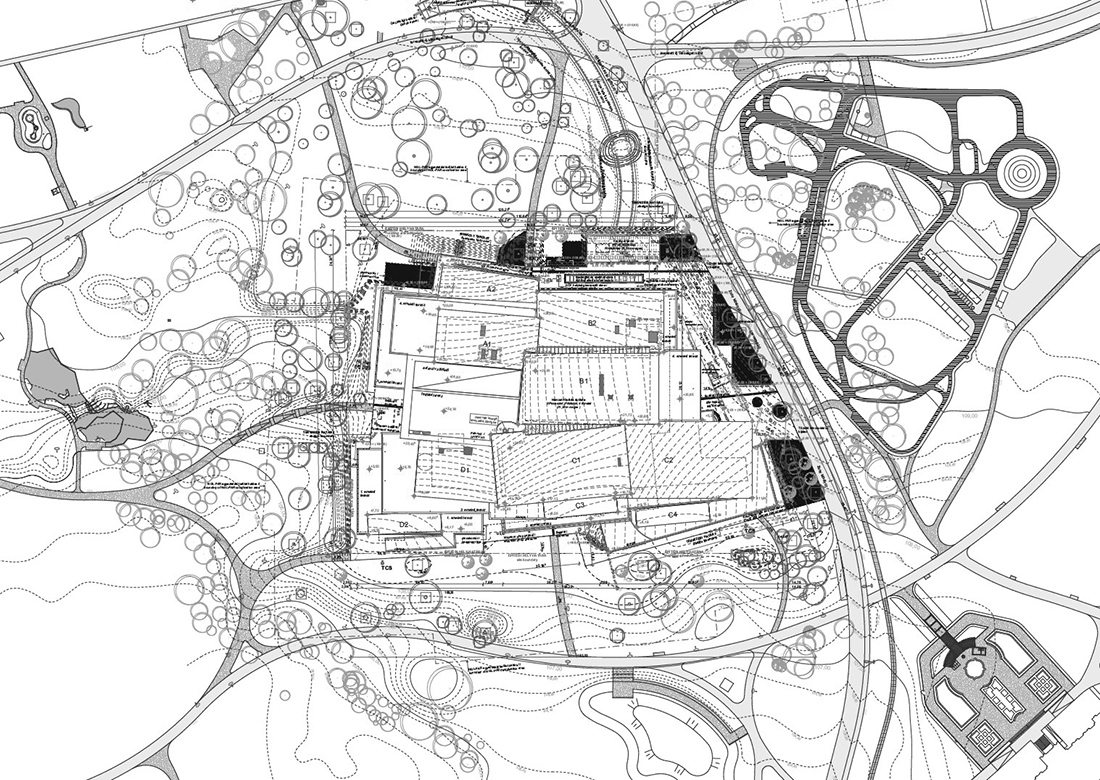 Az épület karakterizáló eleme a kétszer görbült, íves tetőszerkezet. A tető formája és az épületen körbefutó lejtős utak egymásra reflektálnak, játékosan váltakoznak. Ez a szerkezeti rendszer tereket hoz létre az alaplemezek és a tömbök között, lehetővé téve a természetes fény behatolását az épület belsejébe. A tetőszerkezet magassága a lombkoronával egy szinten helyezkedik el, ezzel is kapcsolódva az épületet körülvevő környezethez.